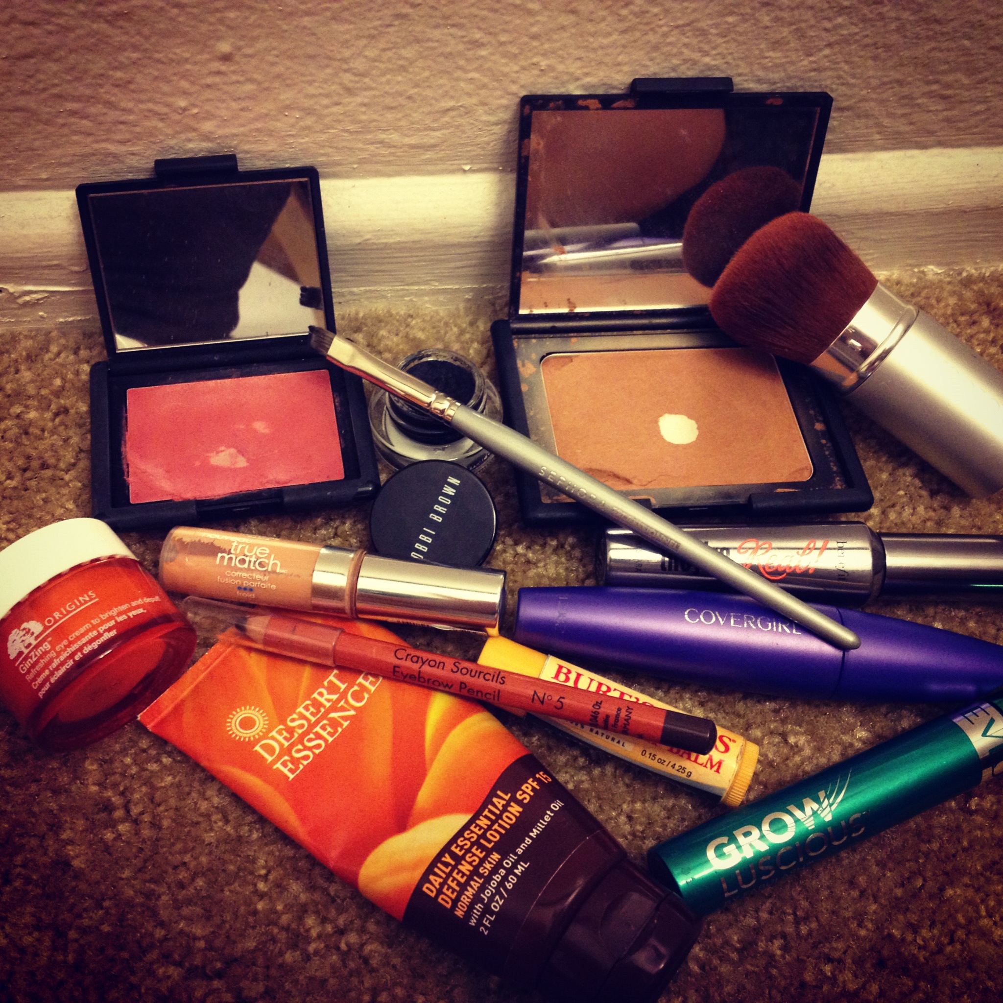So, what does a makeup routine look like with this kind of schedule?  Well, there isn’t really a routine.  I don’t wake up every morning and stand in front of the mirror and put on makeup.  Somehow, my current bathroom space just isn’t conducive to a refreshing, early morning makeup application.  I really need a zen-like environment when I go for the whole schtick, and I don’t have that set-up yet.  And like I said … I’m pretty bad at getting my butt out of bed in the first place.  Like, there have been days where I’ve given myself maybe five minutes to transform from something looking like a “Tazmanian devil” to “acceptable civilian” status, and then jam out the door and on to the freeway.  So, some days I go teach without a single stitch of makeup on, not a lick, without even getting to groom my eyebrows.  Other days, once I’ve arrived at the school, I somehow manage to accrue the time and energy to get on a full face before the kids come in the classroom, but I have to pack my goods first before taking off for the school.  So, what do I pack when I’ve got thirty seconds to grab whatever I can to cover all the bases?