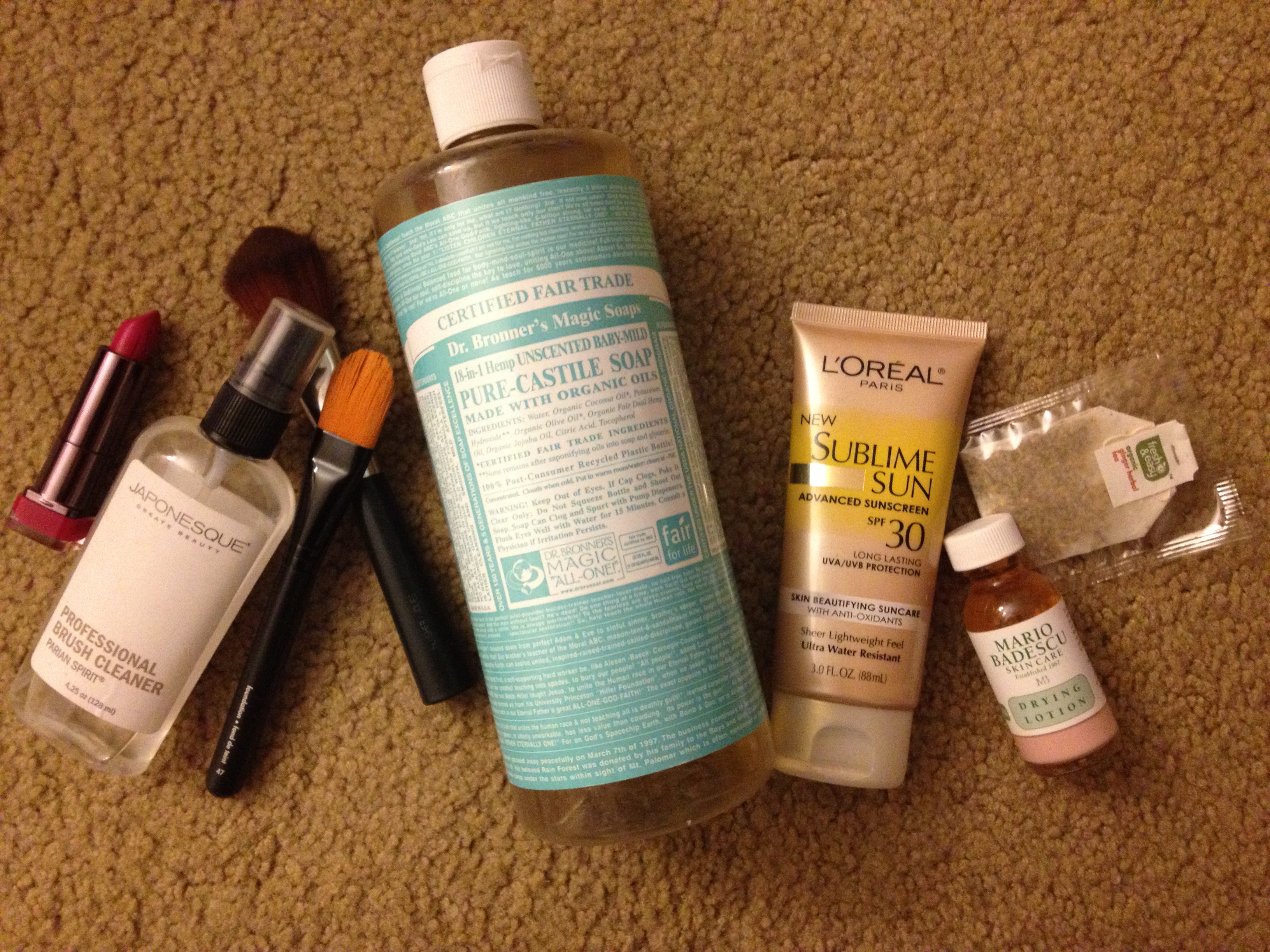 10. And speaking of makeup brushes … please clean them. Please, please clean them. You can use a little Dr. Bronner’s Magic Soap and some water, or a brush cleaner like Japonesque’s Parian Spirit. Once you’ve applied whatever cleaning agent you’re using, brush them gently on a fiberless towel to rub out excess makeup and let them dry overnight. And whatever you do, do not use those sponges they give you in foundation compacts to apply your makeup. Or at least, use that sponge once, throw it out, and then use a different one every time. Using the same sponge over and over just transfers all the dirt and oil from your face into your makeup, and then back on to your face when you use apply again, and so on. Brushes are always a better bet because you can clean them.